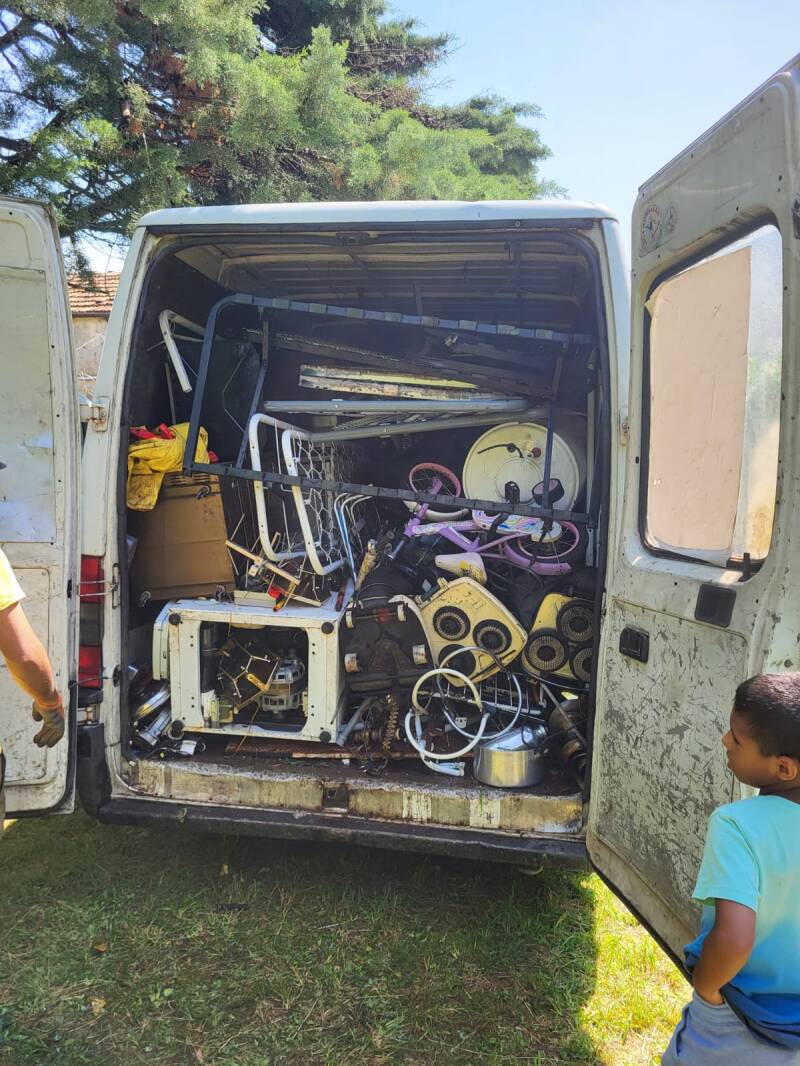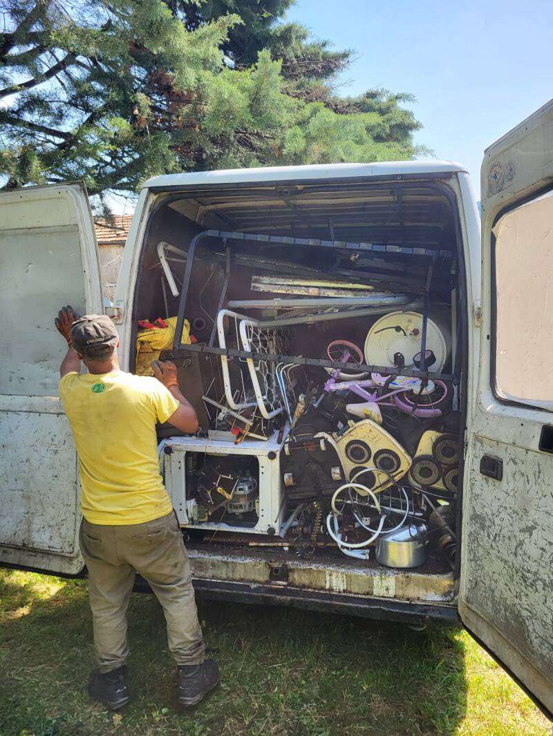 Enrico (de buurman) wist wel iemand die het wilde halen. Samen met Rob hebben we alles op het voorste deel van de tuin gebracht. Net toen de beste man aankwam was er een mega onweersbui. Even 10 min wachten dan laden we het in zei hij. En zo waar tien minuten later scheen de zon.Alles werd vakkundig in de bestelbus geladen. Wat ging er zoal mee, 4 fornuizen, wasmachine, spoelbakken, 8 stofzuigers, heel veel klein metaal zoals bestek etc en 9 gasflessen en nog wat bed bodems.