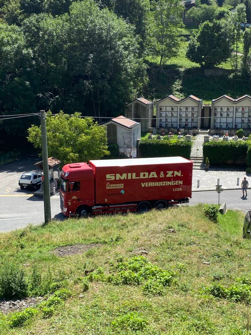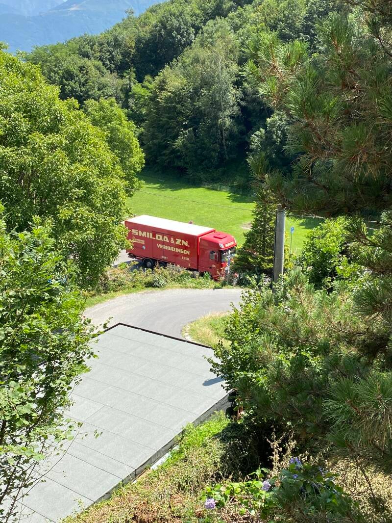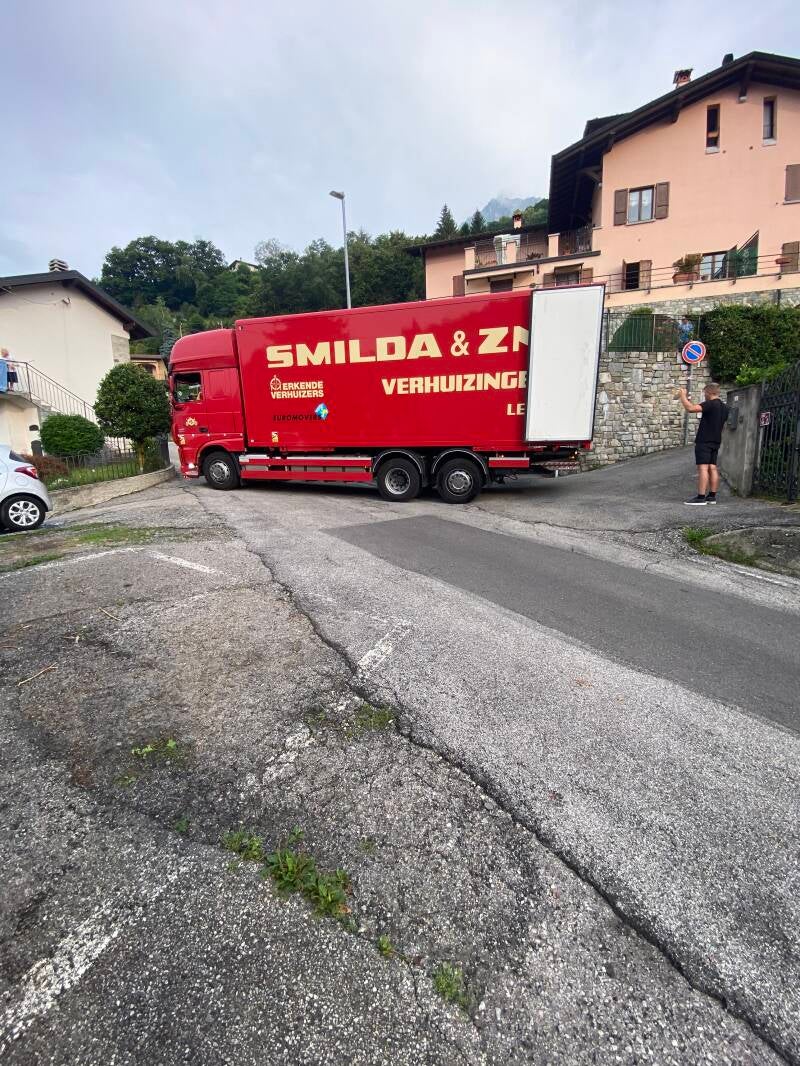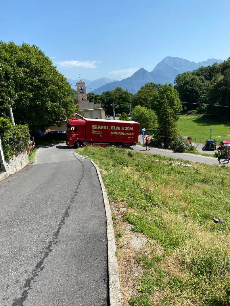 De mannen van Smilda & Zn Transport & Verhuizingen reden het laatste stukje omhoog om vervolgens naast het huis op de weg te staan.