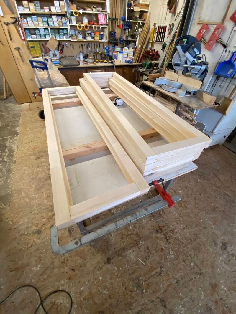 De ramen en een deel van de kozijnen liggen al klaar en een deel hangt al in de spuitcabine.